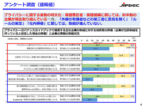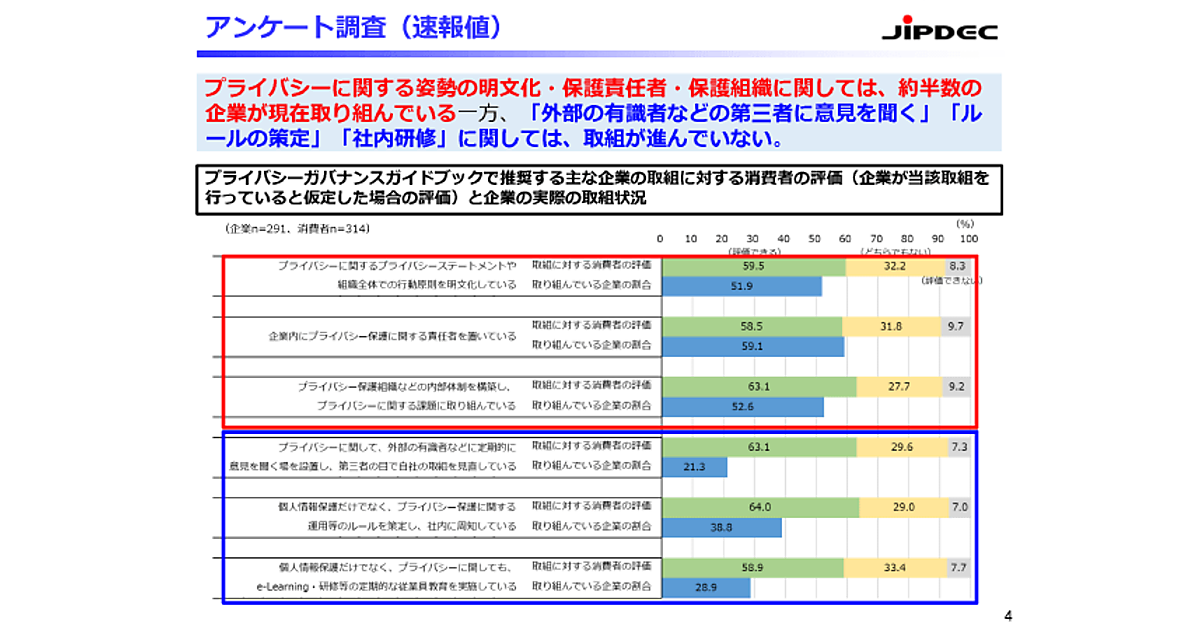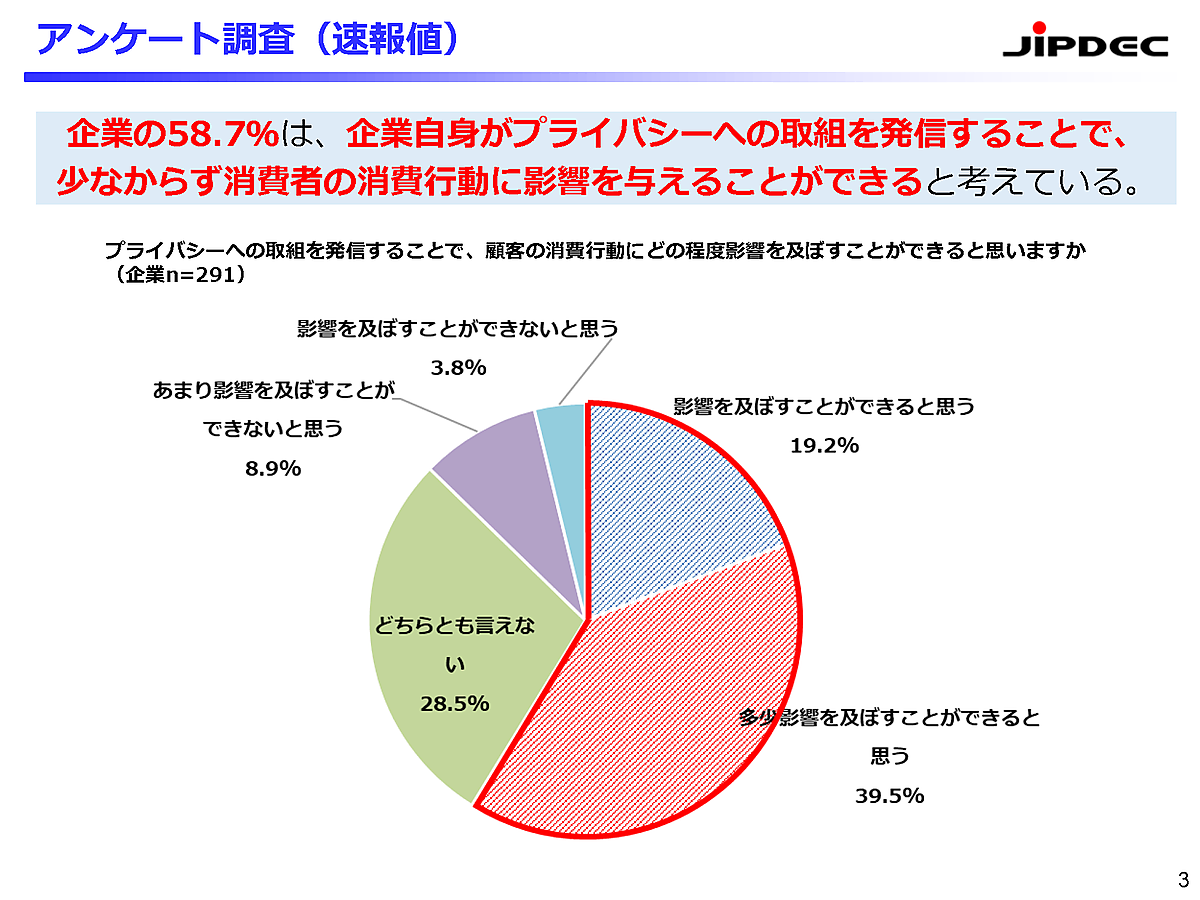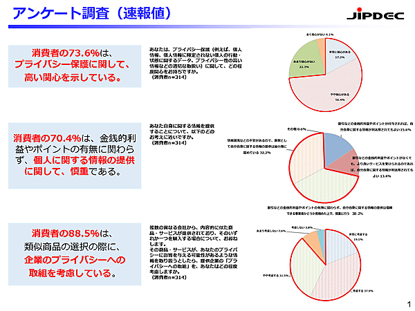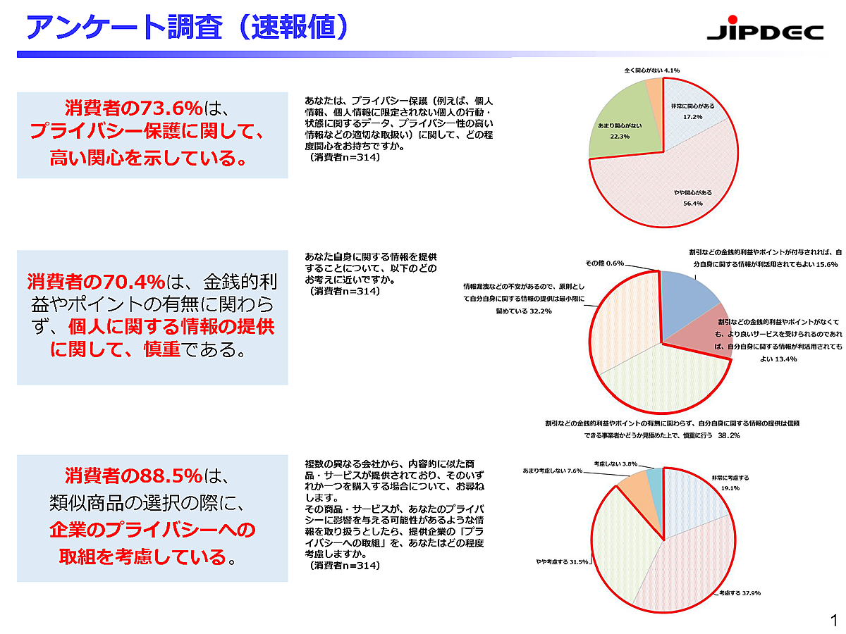 経済産業省、総務省、日本情報経済社会推進協会(JIPDEC)は、「プライバシーガバナンス」に関するアンケートの結果(速報版)を発表した。一般消費者314人、および291社(IoT推進コンソーシアム会員企業)が回答している。
