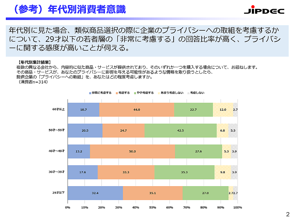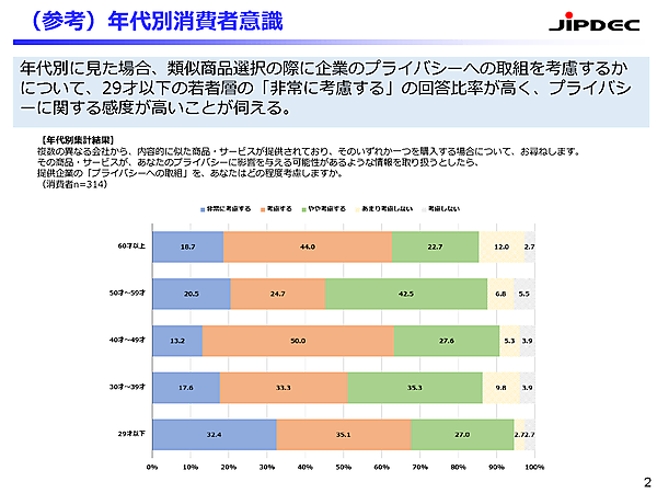 サービス・製品の選択について年齢別で見ると、29歳以下の若者層は「非常に考慮する」が32.4%に達しており特に高い。SNS利用なども多い層だけに、プライバシーの扱いに敏感なようだ。