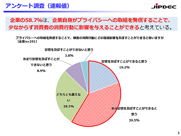 続いて企業側に、プライバシー保護への取り組みを聞いた。まず企業姿勢の考え方として「プライバシーへの取り組み状況を情報発信することで、顧客の消費行動に影響を与えられるか」と聞くと、「できる」と考えていた企業は58.7%に留まった(できると思う+多少できると思うの合計)。