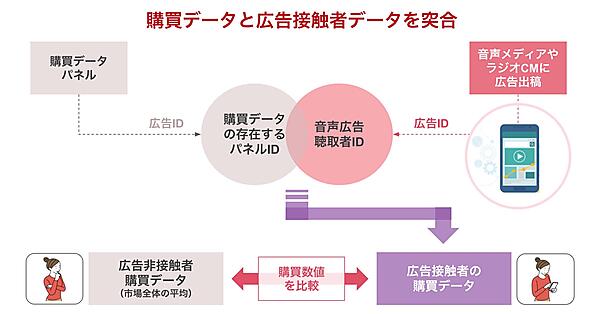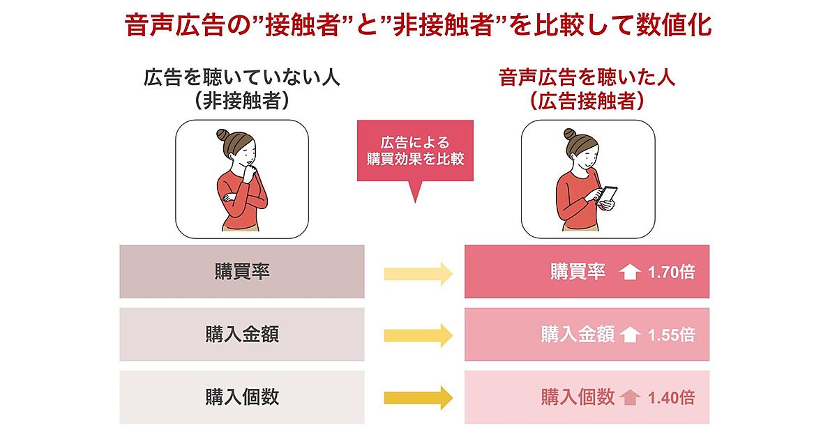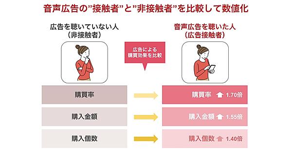 デジタル音声広告事業のオトナルは、ラジオ広告やデジタル音声広告を聴いたユーザーの購買効果を可視化する「音声広告 購買分析パッケージ」の提供を始めた、と11月11日発表した。購買データと音声広告の接触者データを組み合わせ、広告に触れた消費者と触れていない消費者の購買率を比較。音声広告の購買への影響を定量的に測定する。
