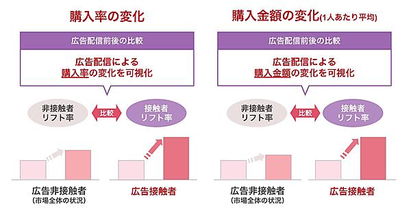 購買分析パッケージは、音声広告の接触者と非接触者の商品購買率の比較や、広告接触前後の購買率・購入金額、購入個数の推移などの変化を可視化することで、音声広告の効果が分析できる。デジタル音声広告は、広告配信時の設計によって配信エリア、広告接触日時、複数パターンの音声広告クリエイティブなどの条件ごとに効果の比較も可能。