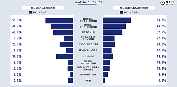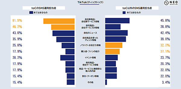 動画活用に焦点を当て、Twitter、TikTok、YouTubeの3つのSNSについて「投稿内容」を聞くと、最多はどれも「自社新商品・自社新サービスの情報」で、「自社商品・自社サービスの情報」「自社のニュース」などがそれに続く。また「toC」だと「イベント情報」が、「toC以外」だと「ノウハウ・お役立ち情報」「アレンジ情報」が人気だ。またTikTokでは「購入者・ファンの紹介」がやや高いが、TwitterやYouTubeでは低く、硬軟の使い分けを感じる。