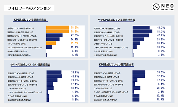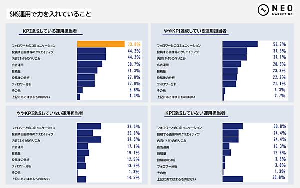 そこで「SNS運用で力を入れていること」を聞き、KPIの達成度合いで比較した。その結果、KPIの達成度合いにかかわらず、ほぼすべての担当者が「フォロワーとのコミュニケーション」に注力していた。ただしその数値は「KPIを達成している運用担当者」73.0%が最も高く、「KPIを達成していない運用担当者」30.8%が最も低い。