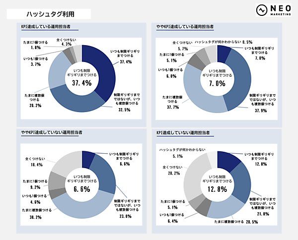 また投稿において「ハッシュタグの利用」について聞き、KPIの達成度合いで比較した。こちらでも「KPI達成している運用担当者」は「いつも制限ギリギリまでつける」37.4%になるなど、他の担当者より圧倒的に高く差異が見られた。KPIを達成できていない場合、投稿のネタ作りより、“ターゲット設定をしっかり行いタグ活用を見直す”ことが有効と思われる。
