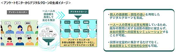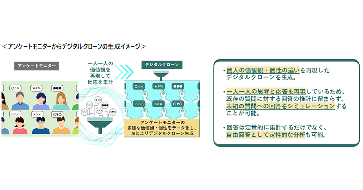 メディアリサーチ事業のビデオリサーチは、パーソナル人工知能(P.A.I.)の研究・開発を行うオルツと共同で次世代型リサーチ「デジタルクローンアンケートシステム」の実証実験を実施し、実際の調査回答者のアンケートモニターを再現した仮想の調査回答者、デジタルクローンの生成に成功した、と11月18日発表した。実証実験の成果の第1弾となる。