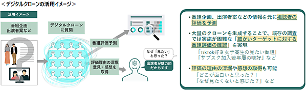 デジタルクローンアンケートシステムは、ビデオリサーチが持つアンケートモニターの性別・年齢・職業・収入などのデータと、オルツのデジタルクローンを結び付け、番組の企画段階での視聴者の評価予測や、調査が難しかった詳細なターゲットの評価把握を可能にする。今回、アンケートモニターから取得したデータを基に、デジタルクローンを生成した。