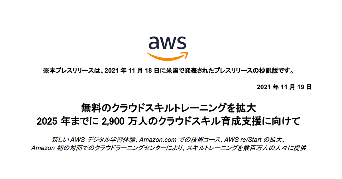 ①新しいデジタル学習体験「AWSスキルビルダー」の提供②「Amazon.com」ウェブサイトへのAWSコースの追加③世界的なリスキル(スキルの再構築)プログラム「AWS re/Start」拡大④初の対面でのクラウド学習専用スペース「AWSスキルセンター」開設--の4つ。世界で600万人以上のスキル習得を支援してきたが、今回さらに数百万人にトレーニングを提供する。