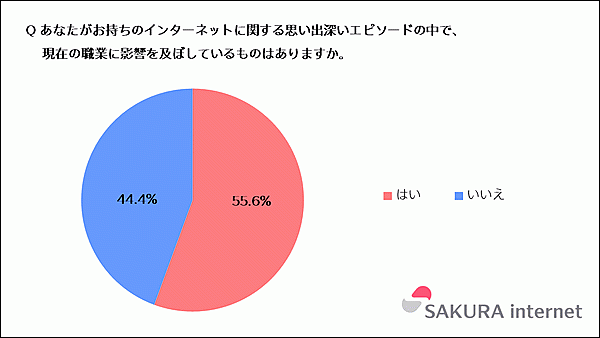 あわせて「インターネットに関する思い出が現在の職業へ影響を及ぼしているか」を聞くと、「はい」55.6%、「いいえ」44.4%で、影響のあった人が半数を超えていた。