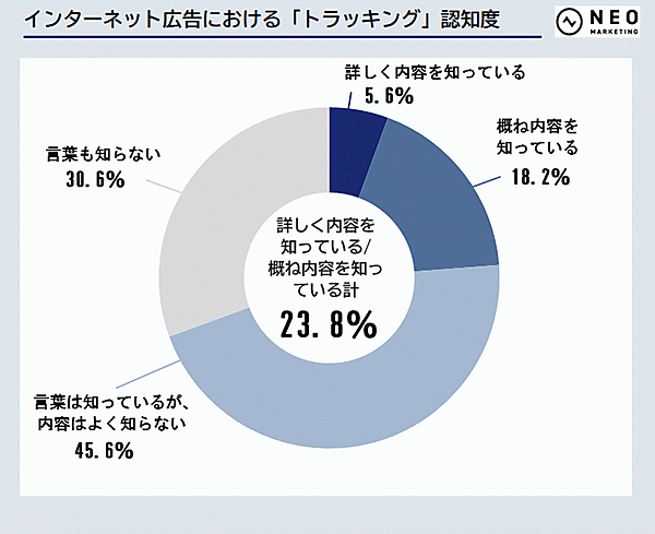 次に、インターネット広告における「広告トラッキング」について聞くと、言葉自体を認知していたのは69.4%だった。ただし「詳しく内容を知っている」5.6%、「おおむね内容を知っている」18.2%で、あまり理解は深まっていない。