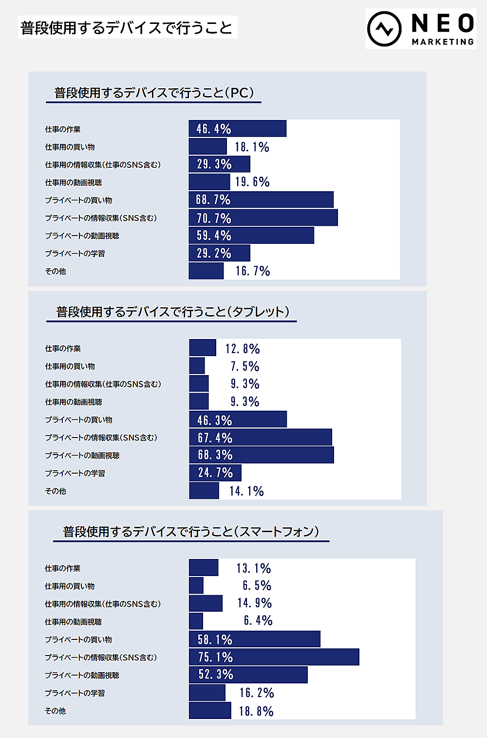 まず「ふだん使用するデバイスで行うこと」を聞くと、他デバイスに比べてPCは仕事目的、タブレットとスマートフォンはプライベート目的で使用されている。ただし、「プライベートの買い物」でPCを使う人は68.7%で、スマホの58.1%を上っていた。