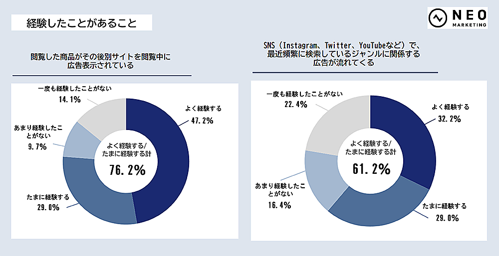そこで広告トラッキングにまつわる具体的な体験(よく経験する+たまに経験するの合計)を聞くと、「閲覧した商品が、その後別サイトを閲覧中に広告表示されている」76.2%、「SNSで、最近頻繁に検索しているジャンルに関係する広告が流れてくる」61.2%などとなり、実体験は過半数が遭遇していることが判明した。広告トラッキングとは理解しないまま、多くの人が「なんか不思議」と思いつつ、受け入れている現状が伺える。
