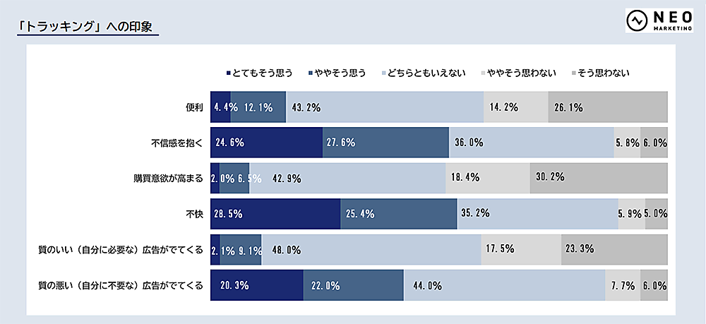 また「広告トラッキングへの印象」を聞くと、「不信感を抱く」「不快」「質の悪い(自分に不要な)広告がでてくる」といったネガティブな項目は、ほぼ半数に達する。一方で「便利」「購買意欲が高まる」は2割台に留まっている。
