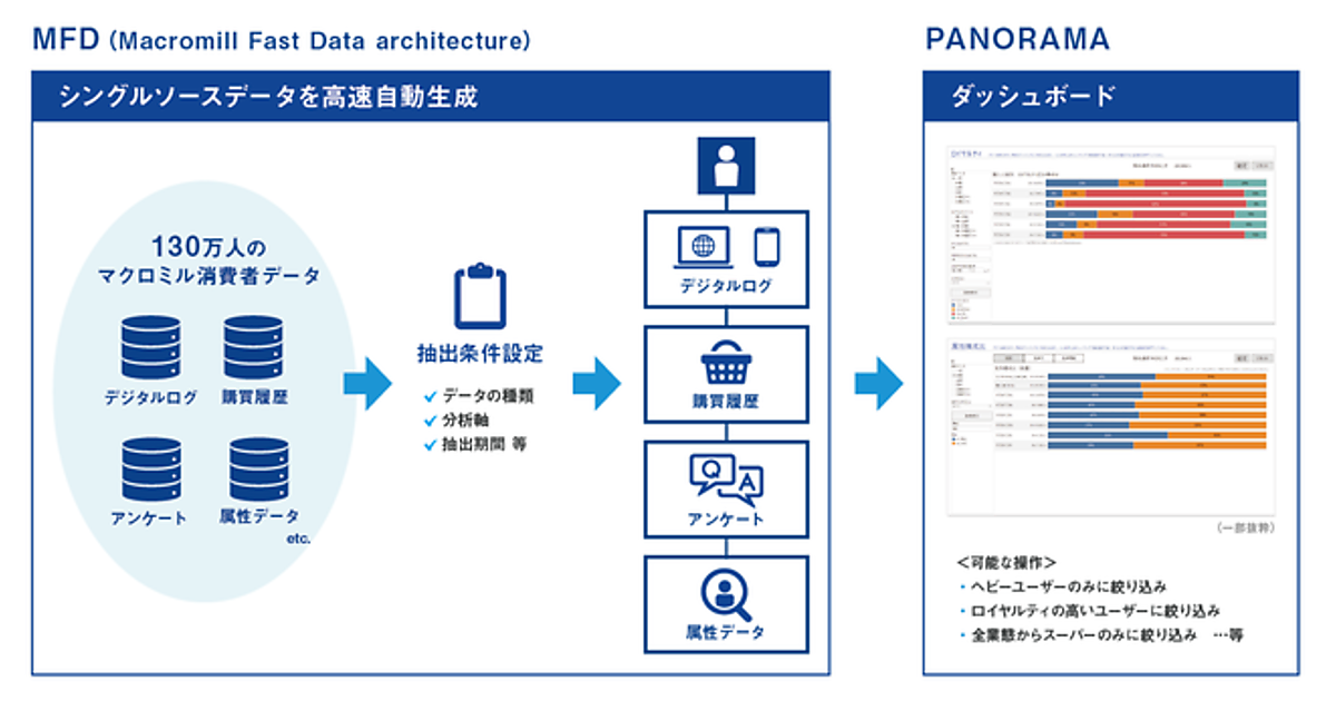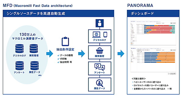 マーケティングリサーチ事業のマクロミルは、同社が保有する130万人の国内消費者パネルデータを、顧客企業の希望に合わせてシングルソース(同じ対象者)でつないで統合データを生成し、ダッシュボードを自動生成する「MFD(Macromill Fast Data architecture)」を開発した、と11月24日に発表した。MFDのアウトプットをダッシュボードに展開して消費者理解をより深める「PANORAMA(パノラマ)」の提供も始める。