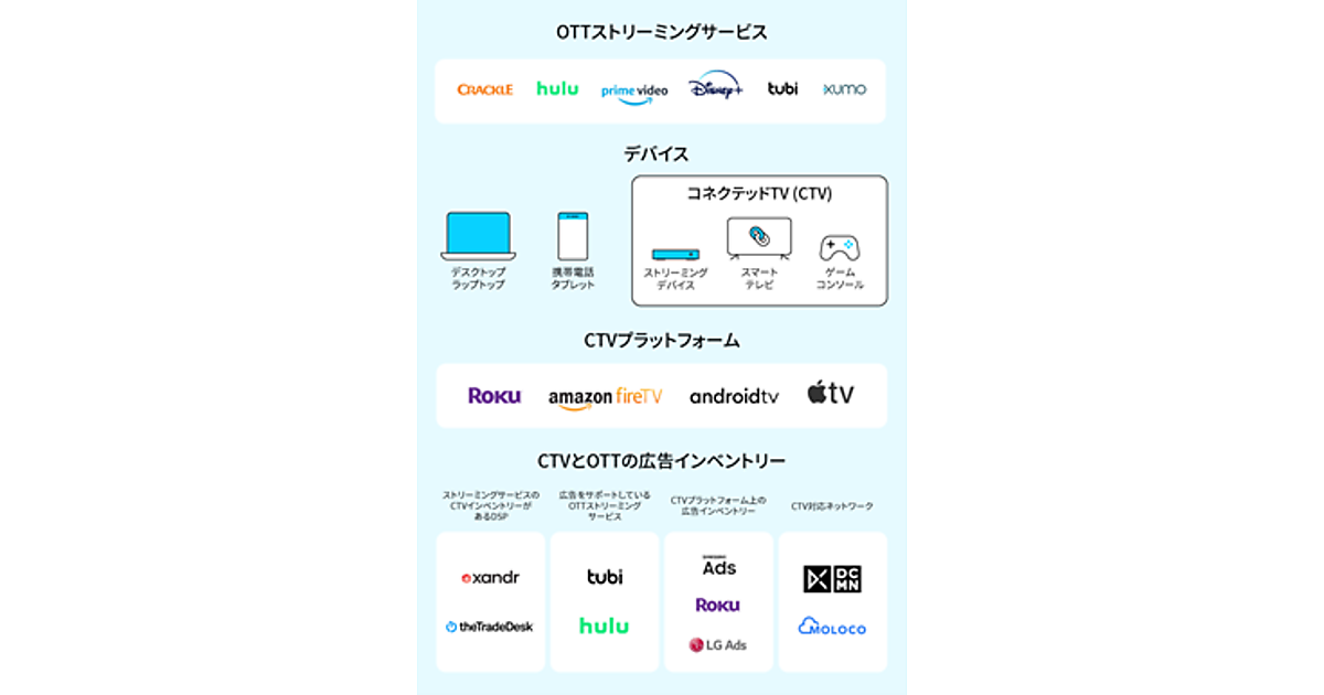 「Apple TV」「Android TV」「Amazon Fire」など主要なCTVプラットフォームに対応して2020年公開したCTVアプリ計測ソリューションを補完する機能として提供。CTV広告計測機能が追加されたことで、モバイルマーケターのためのアトリビューション(チャンネルごとの貢献度分析)データが1カ所にまとめられ、あらゆるオンライン広告に加えてCTVの全チャネルにわたるキャンペーンのパフォーマンスを評価できるようになる。