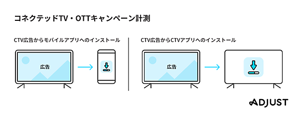 モバイルマーケティング分析を展開するドイツAdjust(アジャスト)は、インターネットに接続したテレビ端末「コネクテッドTV(CTV)」によるモバイルアプリのインストール促進パフォーマンスを計測する「CTV広告計測」機能の提供を始めた、と11月25日に発表した。広告主は、CTV広告の閲覧数からモバイルアプリインストールまでのユーザージャーニー(行動の過程)を把握し、クロスデバイスでインサイト(行動の動機)を取得できる。
