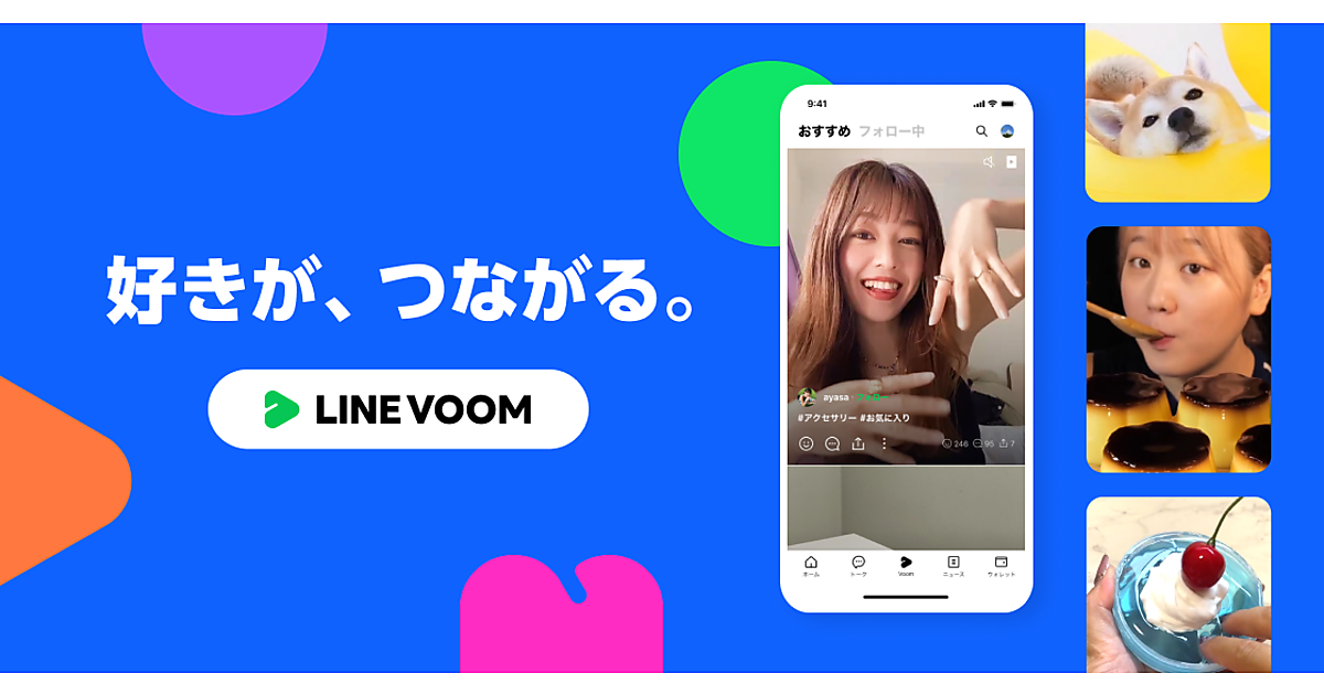 サービス名のVOOMは「Video Room」「Visual Room」「Boom」を掛け合わせた造語。気軽に動画を楽しみ、新たなトレンドやブームを生み出す意味を込めた。気に入った動画にリアクションやコメントを送ったり、そのままLINE上で友だちにシェアしたりできる。コメディや動画版ブログのVlog、ペット、音を楽しむASMR、ダンス、レシピなど多岐に渡るジャンルの動画コンテンツが集まる。
