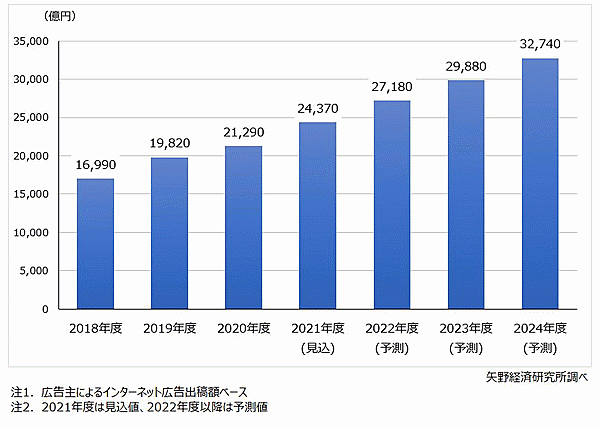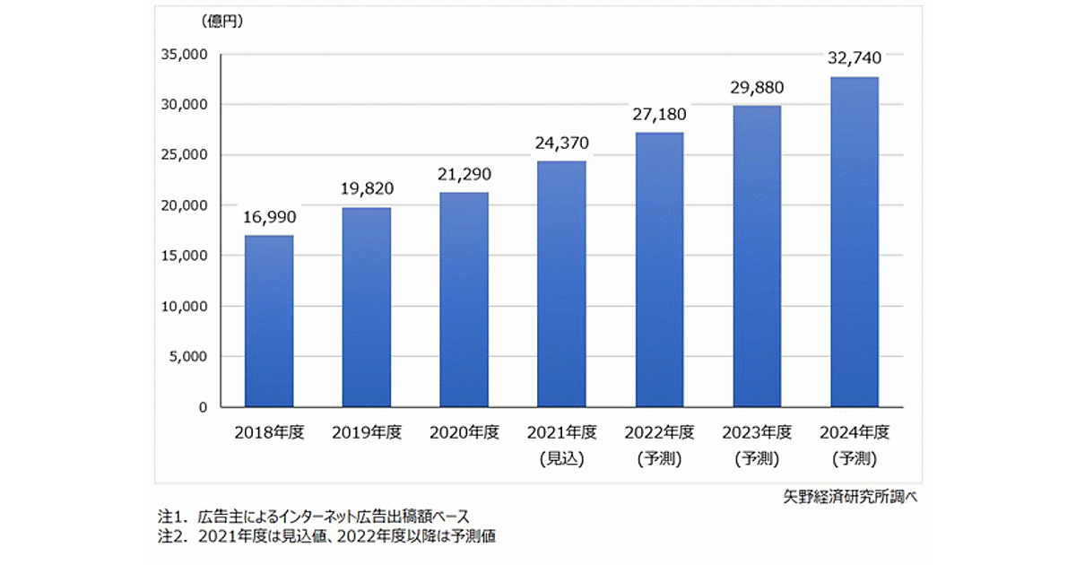 今年2021年度はコロナ禍の収束が見えつつあり、巣ごもり需要でのEC拡大でインターネット広告が伸長したこと、動画プラットフォーム拡大により動画広告が増加していることなどから、インターネット広告市場規模はさらに拡大基調で、2020年度比114.5%の2兆4,370億円に達する見込みとなった。
