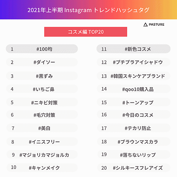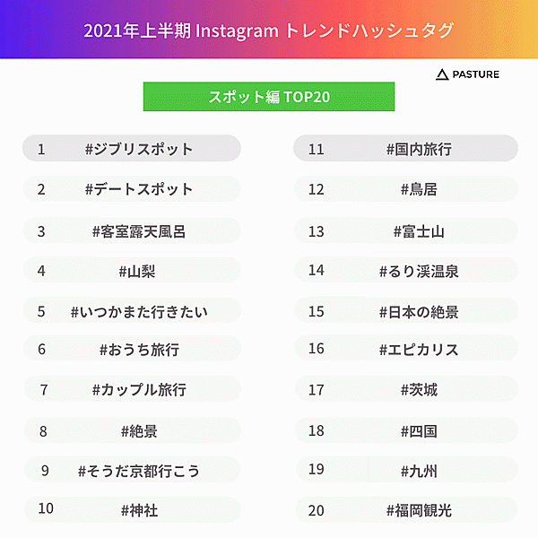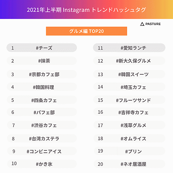 パスチャーは、Instagramのハッシュタグについて、2021年上半期のトレンドを分析した結果を発表した。約600の調査対象アカウントの投稿について、「グルメ」「コスメ」「スポット」の3カテゴリ関連の人気タグを、同社の分析ツール「MASAI」により分析した。