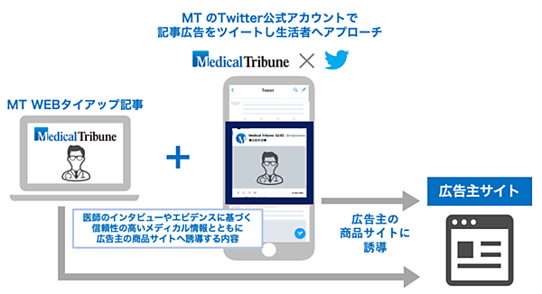 電通グループ子会社で医療用医薬品のマーケティングなどを手掛ける電通メディカルコミュニケーションズは、医学・医療関連メディアを展開するメディカルトリビューン(MT)とともに、信頼性の高いヘルスケア情報を発信する広告サービス「Medical Tribune×Twitter」を12月1日に始める、と11月29日発表した。生活者に正しいヘルスケア情報を届けることが目的。