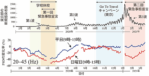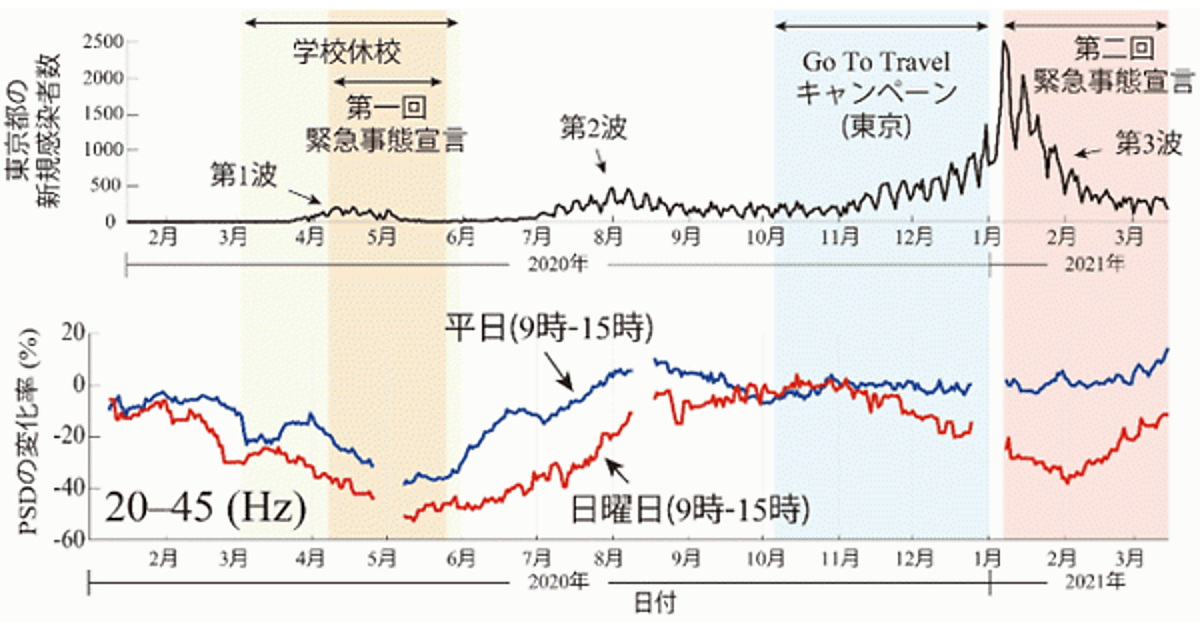産業技術総合研究所(活断層・火山研究部門)と九州大学(地球資源システム工学部門)は、「地震計データの、地震観測以外の新しい活用」として、新型コロナウイルス感染拡大にともなう社会活動の低下を、首都圏に設置された地震計データから読み取ったことを発表した。