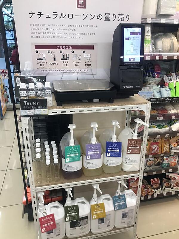 量り売りは、容器に使われるプラスチックの削減を狙いに、ナチュラルローソンで2020年8月に導入した。現在は9店舗で実施し、うち5店舗は日用品に加えてドライフルーツ、ナッツなど食品も販売している。量り売りによってプラスチック容器での販売と比べ、プラスチック使用量の約79%削減につながった。ローソン店舗にも広げることで一層のプラスチック削減を図る。