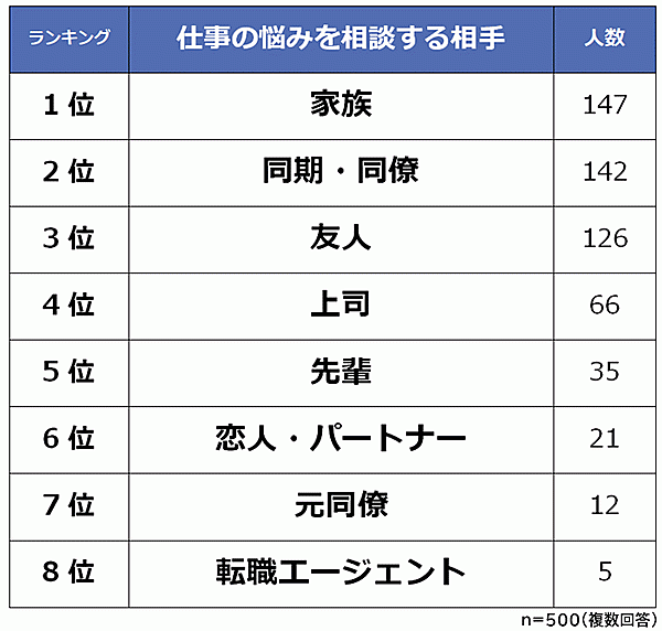 ビズヒッツが運営するメディア「Biz Hits」は、「仕事の悩みを相談する相手」に関する調査結果を発表した。社会人男女500人が回答している。