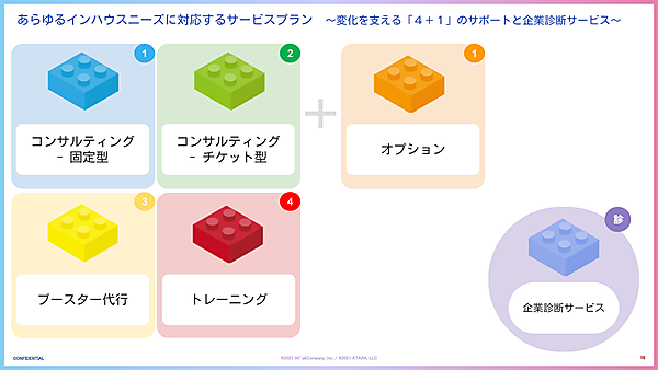 伴走型インハウス支援は、①コンサルティング固定型②コンサルティングチケット型(必要な時・量だけ)③ブースター代行(広告運用関連作業の代行)④トレーニング(座学と実践)⑤オプション(各種ツール・システムの導入支援・分析)⑥企業診断・計画立案--の各サービスで内製化を支える。企業の目的や課題によって自由に選択・組み合わせられる。