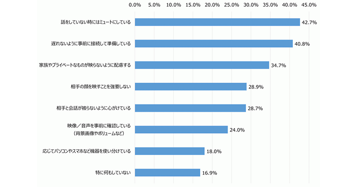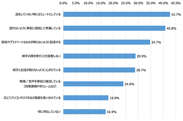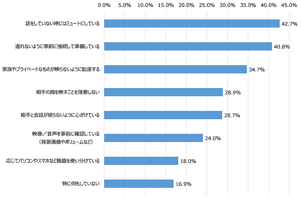 まず「オンライン会議の際に意識しているマナー」について聞いてみると、「話をしていないときにはミュートにしている」42.7%、「遅れないように事前に接続の準備をしている」40.8%、「家族やプライベートなものが映らないように配慮」34.7%、「相手の顔を映すことを強要しない」28.9%、「相手と会話が被らないように心掛けている」28.7%などが上位となった。