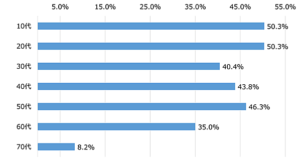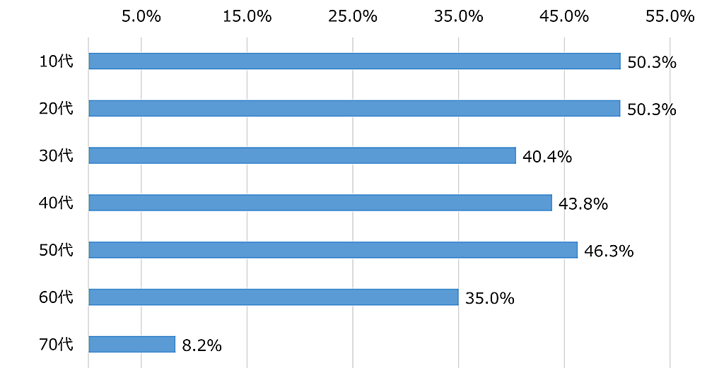 一方、オンライン会議の際に意識しているマナーについて「特に何もしていない」と回答した人を年代別で見ると、10~50代は10%台だったが、60代は30%、70代は35.3%に達する。50代以下と60代以上では“オンライン会議のマナー”に大きな断絶があると感じさせる。また10代・30代に比べ20代は特に少なく、“オンライン会議のマナーにうるさい世代=20代”ということがうかがえる。