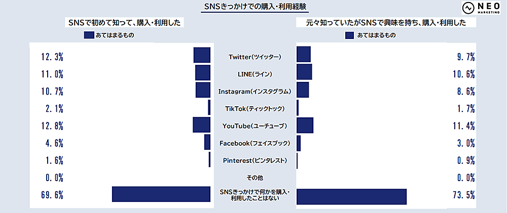 そこで「SNSきっかけでの購入・利用経験」を聞くと、「SNSきっかけで何かを購入・利用したことはない」が7割を占めたが、購入に至った人では「Twitter」や「YouTube」が上位だった。