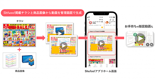 管理画面で簡単に動画が作成でき、作った動画は店舗商圏内のShufoo!ユーザーのアプリ上に掲載される。ユーザーが動画をタップすると、店舗が投稿したチラシなどのコンテンツや営業時間、電話番号などが掲載されるShufoo!内の店舗詳細ページや、企業のウェブサイトに誘導できる。CM用動画など既にある素材の利用も可能。Shufoo!動画チラシProに追加料金は不要。