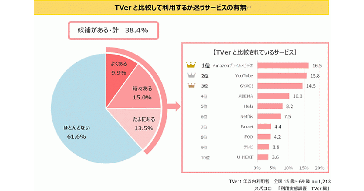 現在のTVer利用者に対して「TVerに代わって選んだり、TVerとどちらを利用するか迷うサービスはあるか?」と聞くと、「ある」38.4%、「ほとんどない」61.6%となり、6割以上が他と比較せず利用している。具体的に比較したサービスでは「Amazonプライム・ビデオ」「YouTube」「GYAO!」が上位だった。アニメやドラマの場合、Amazonなどで1週遅れて配信開始になる作品も多いが、“そこまで周回遅れになりたくない”とTVerでいち早く視聴しておく、というニーズはあるだろう。“CMをいっさい見たくない”という人はサブスク動画配信を使っているようだ。