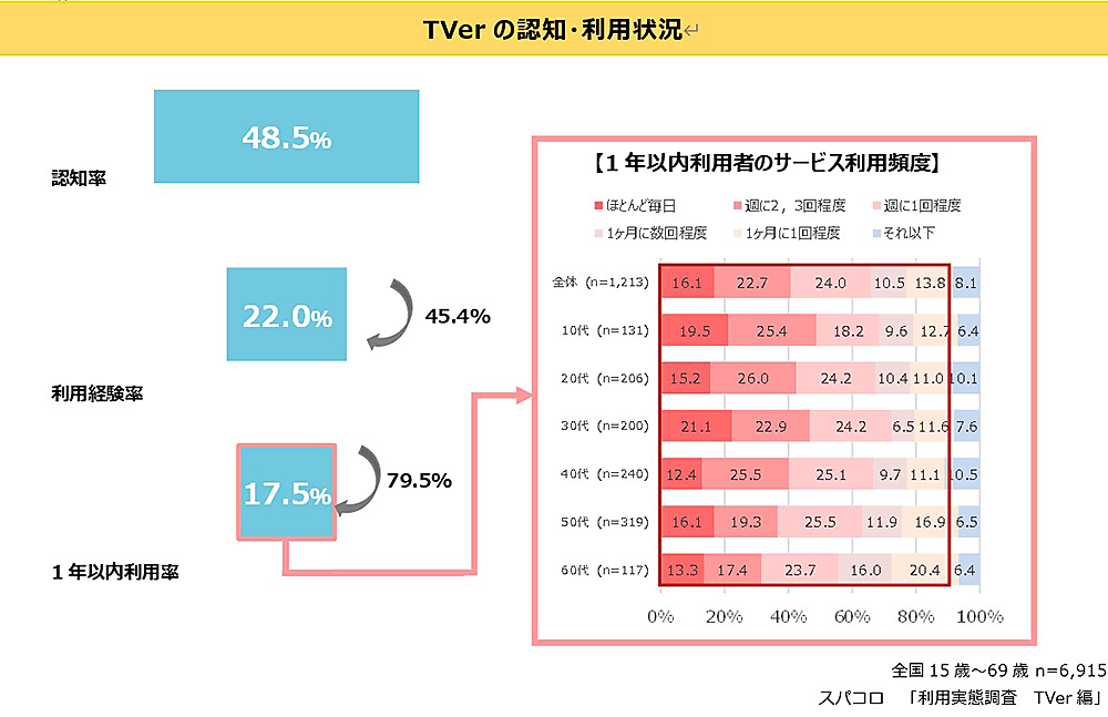 全国15~69歳の6,915名に、まずTVerを知っているか・利用経験はあるかを聞くと、認知率は全体の48.5%、利用経験率は22.0%、現在利用率(1年利用率)は17.5%だった。