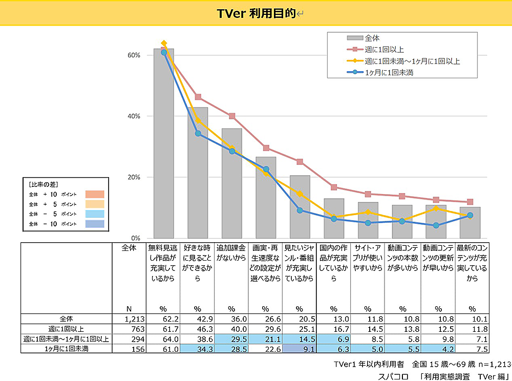 「TVerを利用している理由(利用目的)」では、「無料見逃し作品が充実しているから」62.2%、「好きなときに見ることができるから」42.9%、「追加課金がないから」36.0%が上位だった。利用頻度別では、「追加課金がない」「見たいジャンル・番組が充実している」「国内の作品が充実している」といった項目でかなりの差が出ており、利用頻度が高い人ほどこれらの利点を評価していることがわかる。