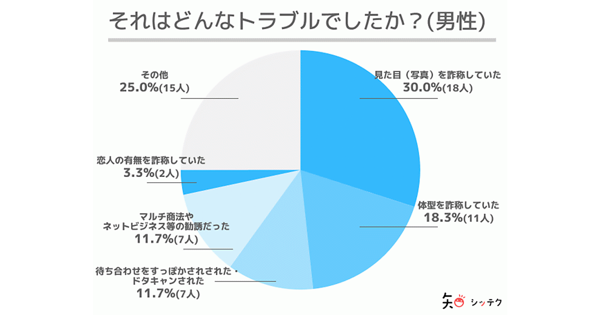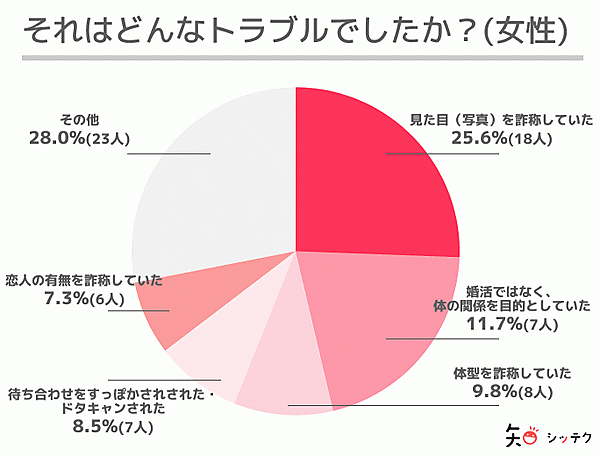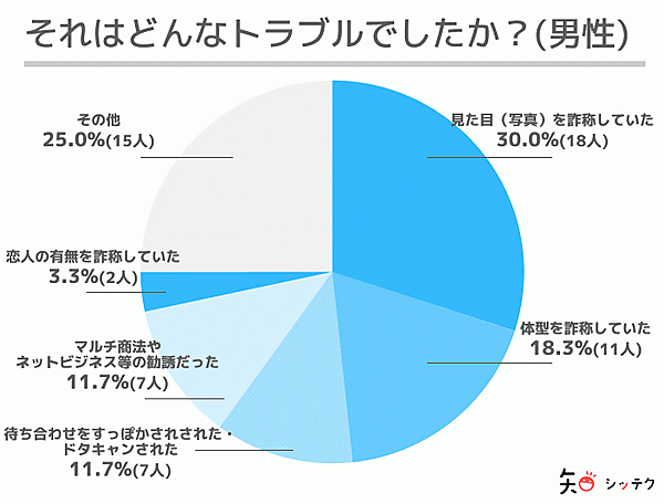具体的なトラブル内容を聞くと、男性ユーザーは「見た目(写真)を詐称していた」30.0%、「体形を詐称していた」18.3%、「待ち合わせをすっぽかされた・ドタキャンされた」11.7%が上位だった。一方女性は「見た目(写真)を詐称していた」25.6%が男性同様に最多だが、「婚活ではなく、体の関係を目的としていた」20.7%、「体形を詐称していた」9.8%となっており、男女でやや異なる傾向が見られる。