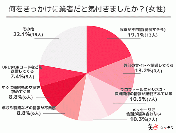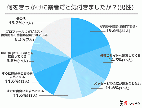 そこで「マッチングアプリを利用していて、アプリ内で業者のアカウントに遭遇したことはありますか?」と聞くと、男性の33.3%、女性の16.8%が「はい」と回答した。そこで、業者に遭遇したというユーザーに「何をきっかけに業者だと気付きましたか?」と聞くと、男女ともに「写真が不自然(綺麗すぎる)」が1位で、それに「外部のサイトへ誘導してくる」が続いた。「写真の人が綺麗すぎて怪しい」「プロフィール写真が合成のようで、おかしい」など、写真の違和感から業者と気付くケースが多いようだ。