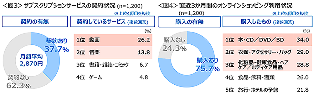 なお「現在何らかのサブスクリプションサービスを契約している」という人は37.7%で、「動画」26.2%、「音楽」13.8%が上位。月額利用料金の平均は2,870円だった。一方「オンラインショッピングを利用した(直近3カ月間)」という人は75.7%。「本・CD/DVD/BD」34.0%が最多で、巣ごもり需要がファッションや化粧品を上回った形だ。