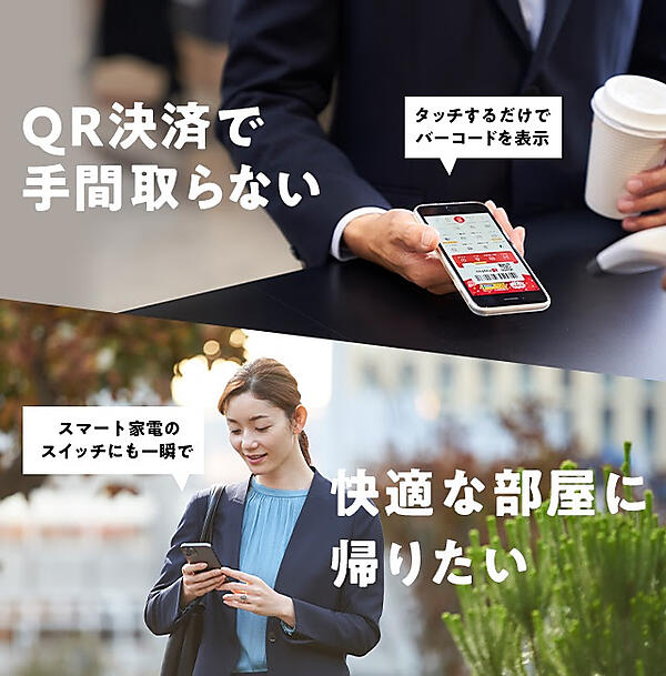 JITAN SUITのボタンに内蔵したNFCタグに利用したいスマホ決済や音楽再生・各種SNSなど普段よく利用するアプリを登録しておき、スマホをかざすとそのアプリが瞬時に起動する仕組み。スーツはメンズとレディスで企画し、NFCタグはメンズスーツのジャケットの前ボタンと左右の袖ボタンに計3つ、レディススーツにはジャケットの前ボタンと裏地の織りネームに計2つを内蔵する。登録したアプリはいつでも書き換えることができる。
