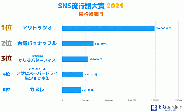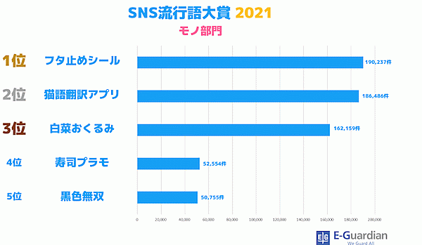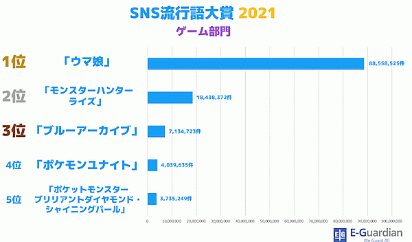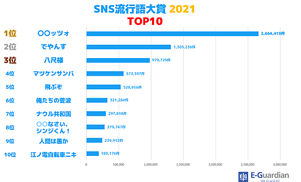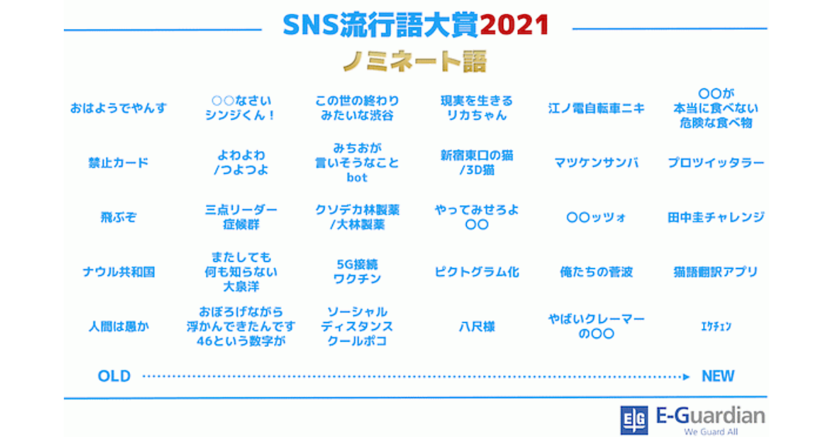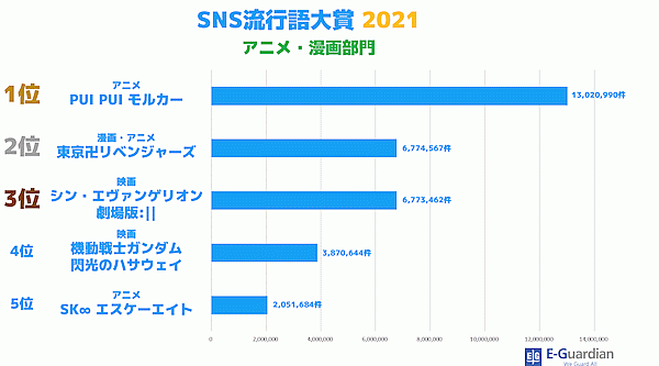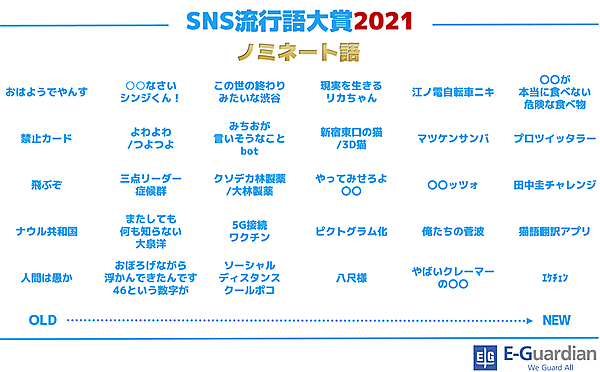 イー・ガーディアンは、「SNS流行語大賞 2021」を発表した。2021年1月1日~2021年11月12日の期間に、Twitter上で頻繁に使用されたフレーズを調査し、その年に最も多く投稿された(バズった)ワードを決める大賞となっている。
