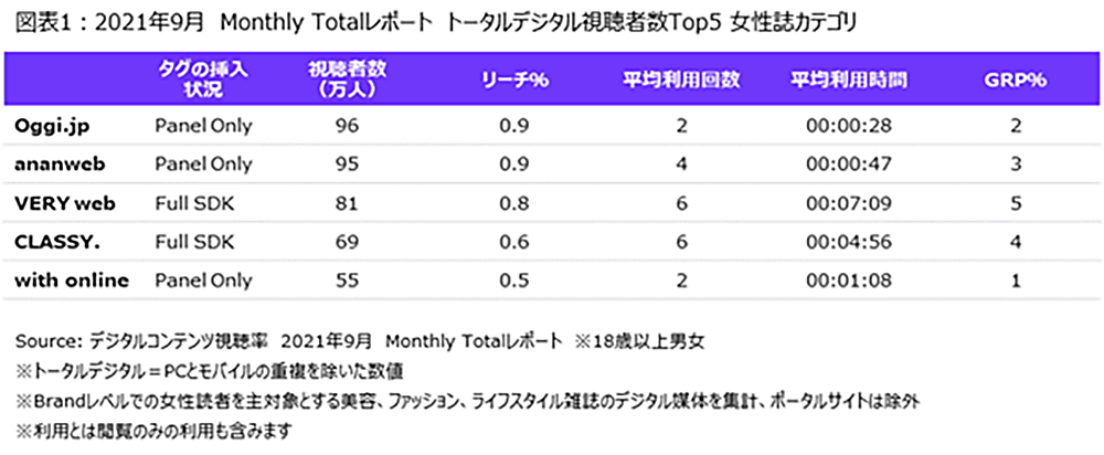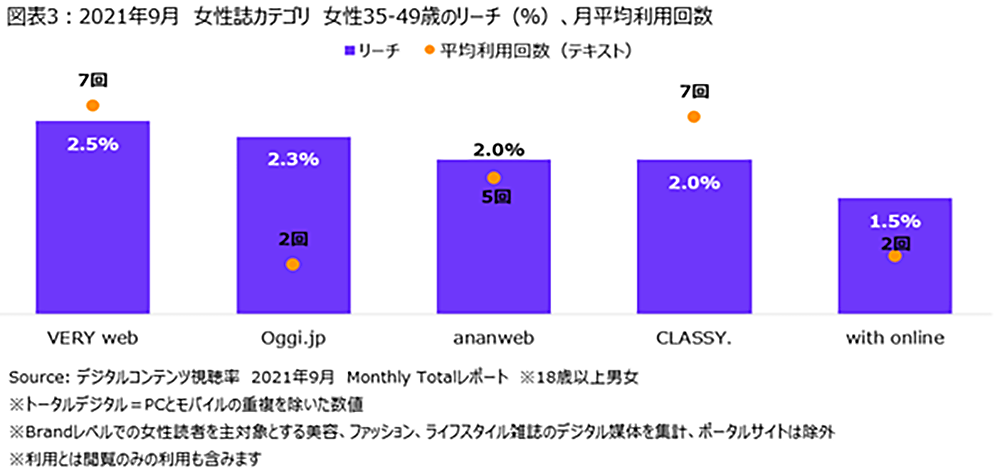 2021年9月のMonthly Totalレポートによると、女性誌カテゴリにおいて、もっとも利用者数(18歳以上)が多かったのは「Oggi.jp」(小学館)と「ananweb」(マガジンハウス)で、ともに約95万人が利用している。3位には利用者数81万人の「VERY web」(光文社)が続く。