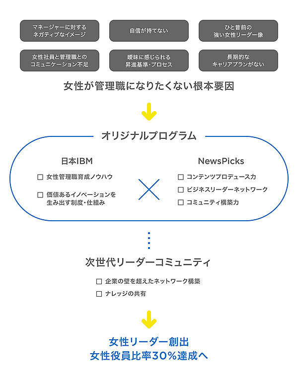 このプログラムは、働く女性の実力を高めてキャリア形成を支援するためにニューズピックスが立ち上げたプロジェクト「NewsPicks for WE」の一環として両社で共同開発した。日本IBMの女性活躍に向けた施策とノウハウを基に、ニューズピックスのコンテンツプロデュース力やコミュニティ構築・運営の知識を活用する。次期女性管理職候補が対象となる。