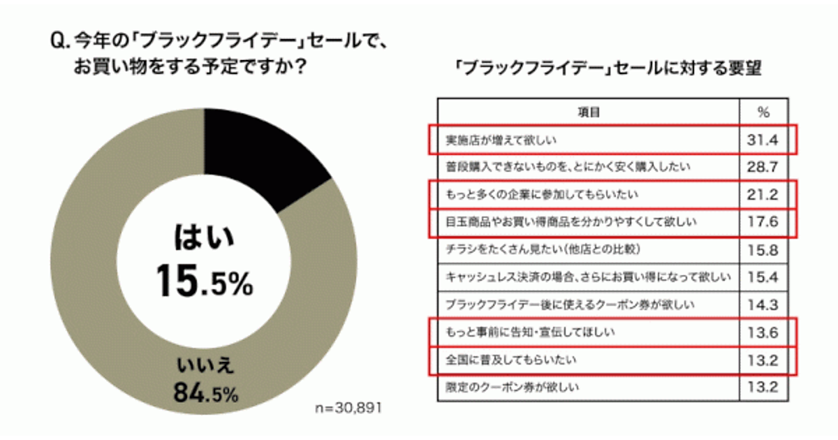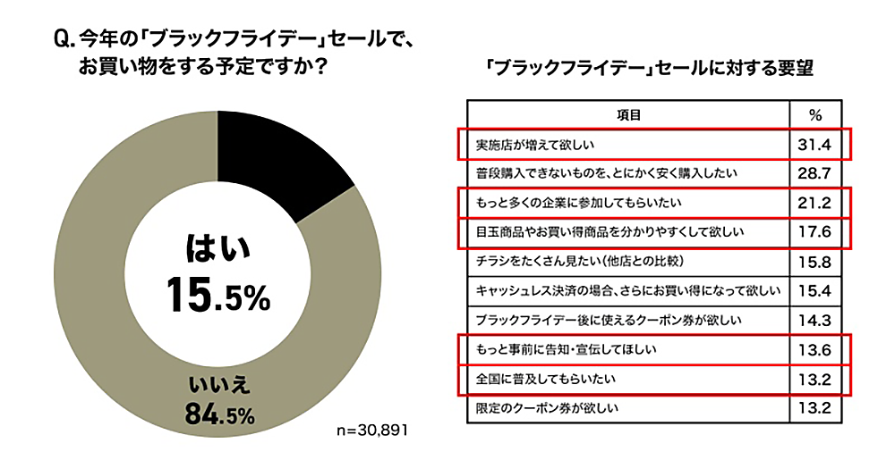 一方「今年のブラックフライデーで買い物をする予定があるか」を聞くと、「はい」は15.5%に留まっており、まだまだ“リベンジ消費”の熱は高まっていないようだ。「ブラックフライデーセールに対する要望」では、「実施店が増えて欲しい」31.4%、「普段購入できないものを、とにかく安く購入したい」28.7%、「もっと多くの企業に参加してもらいたい」21.2%が上位だった。一般的な年末セールとして実施している店舗やチェーンがまだ限定的な様子がうかがえる。