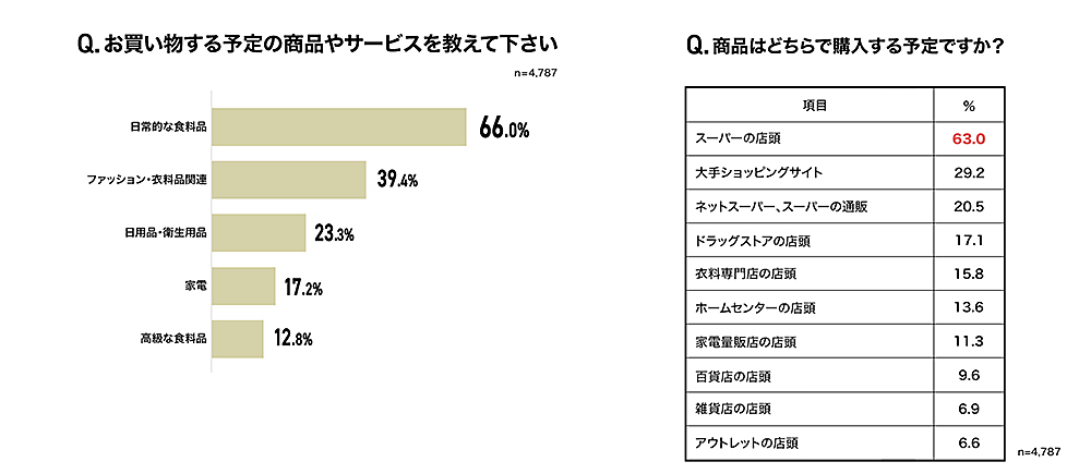 「ブラックフライデーのセールで買い物する」と回答した人に購入予定の品を聞くと、「日常的な食料品」66.0%が最も多かった。購入場所についても「スーパーの店頭」63.0%が1位で、2位以下を大きく引き離している。高額商品を買うより、食料品・日用品をより安く買おうという人が多いようだ。