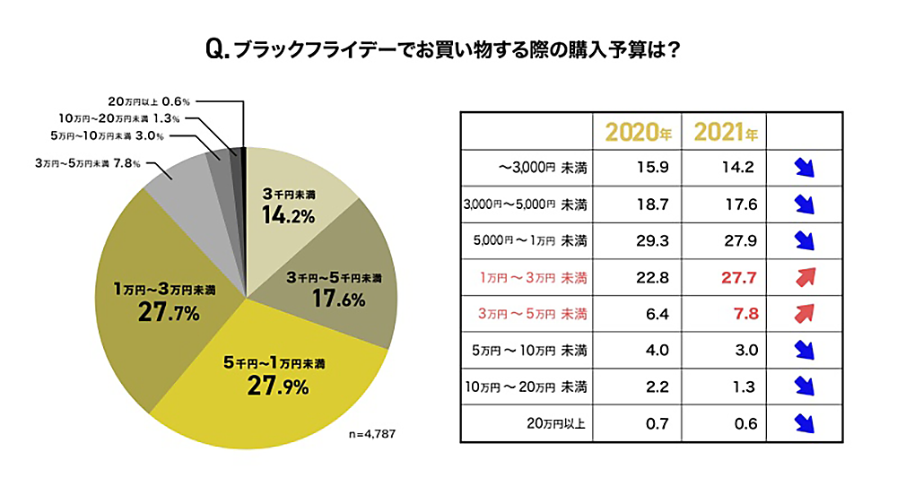 予算は、「5千円~1万円未満」27.9%が最多で、「1万円~3万円未満」27.7%がそれに続く。昨年と比較すると、やや予算に余裕が出ているようだ。