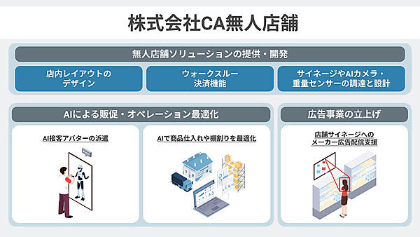 インターネット広告事業のサイバーエージェントは、小売店向けに無人店舗ソリューションの提供・開発と販売促進支援を手掛ける新しい子会社、CA無人店舗を11月19日に設立した、と12月14日発表した。無人店舗の展開が加速する中、AI(人工知能)技術を活用し、無人店舗の新規出店、有人店舗の無人化、販促、広告事業の立ち上げのサポートを一括して実施する。