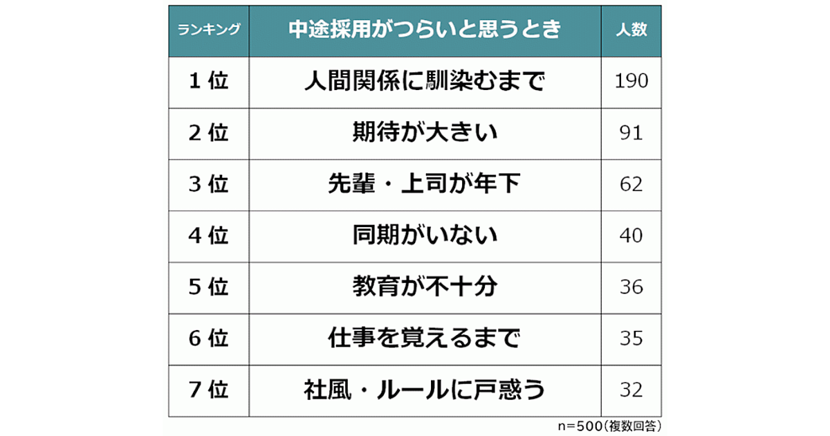 一方ビジネス面では、5位「教育が不十分」、7位「社風・ルールに途惑う」という声も一定数存在する。なお8位以下には「待遇面で生え抜き社員より不利だと感じるとき」「相談相手がいないとき」といった意見もあった。