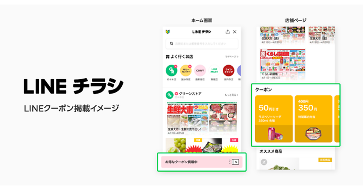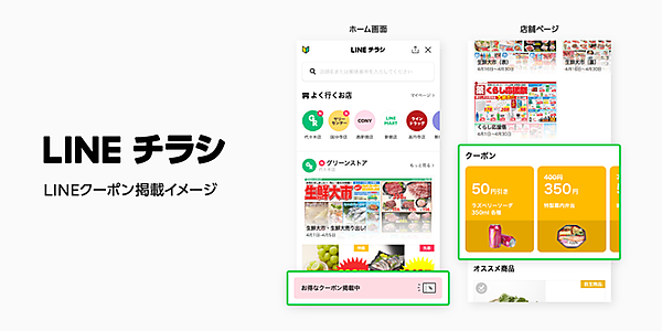店舗がLINEクーポンにクーポン情報を掲載している期間中は、LINEチラシのホーム画面に「お得なクーポン掲載中」の告知が表示されるため、LINEチラシ内の店舗ページの閲覧数の増加が期待できる。連携によってユーザーは、LINEチラシ上で店舗のチラシとクーポンがまとめて見られるようになり、お買い得情報を見逃すことがなくなる。