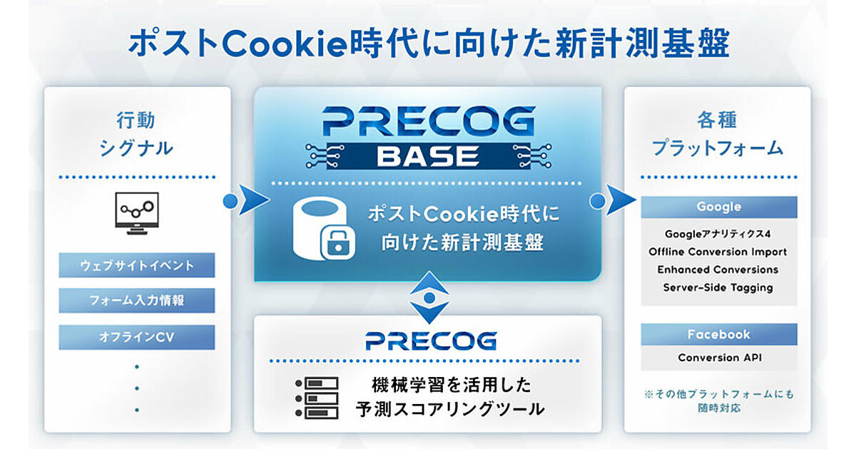 Cookieはウェブサイトがスマートフォンやパソコンに保存する情報。規制の動きが世界的に広がり、日本でも改正個人情報保護法が2022年4月に施行されることからPrecog Baseを開発した。サイトの行動データやフォーム入力情報などをクラウドサーバー環境で連携処理することで、データプライバシーに配慮しながらCookieに頼らない新たな計測基盤の構築を可能にした。