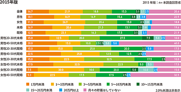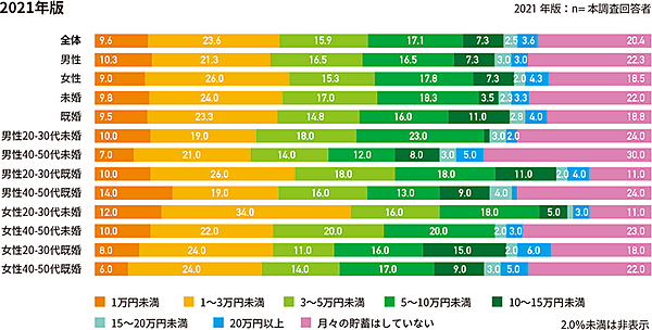 そこで「毎月の貯蓄額」(ボーナスを除く1か月平均)を聞くと、「1万円未満」層が少なくなっていた。性年代・未既婚別では「女性40~50代未婚」で額面が伸びている。一方で、「男性20~30代未婚」は、10.0%→24.0%と「貯蓄をしない」層が大幅に増加したことが明らかとなった。