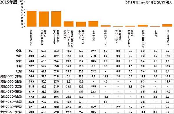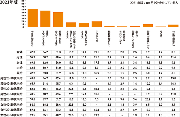 そこで「貯蓄をしている理由」を選択式(複数選択可)で聞くと、「老後資金のため」が増加しており、特に既婚者での増加傾向が顕著だった。しかしここでも「男性20~30代未婚」が唯一、老後資金のために貯蓄をする傾向が低くなっていた。